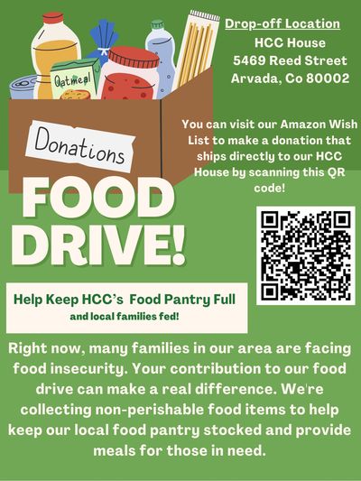 You can bring non-perishable food items to our HCC House located at: 5469 Reed Street. Arvada, CO 80002.